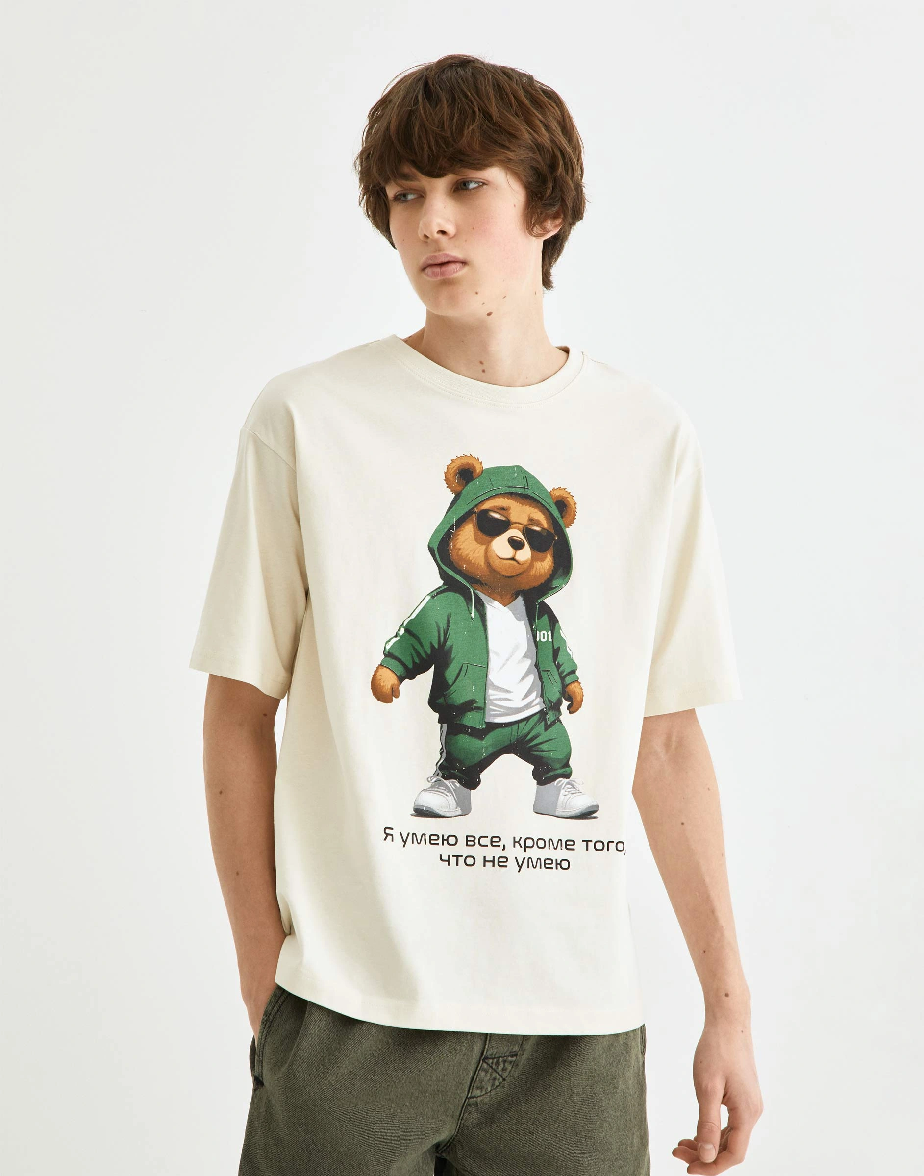 Бежевая футболка oversize с русским текстом Bkt017588-1