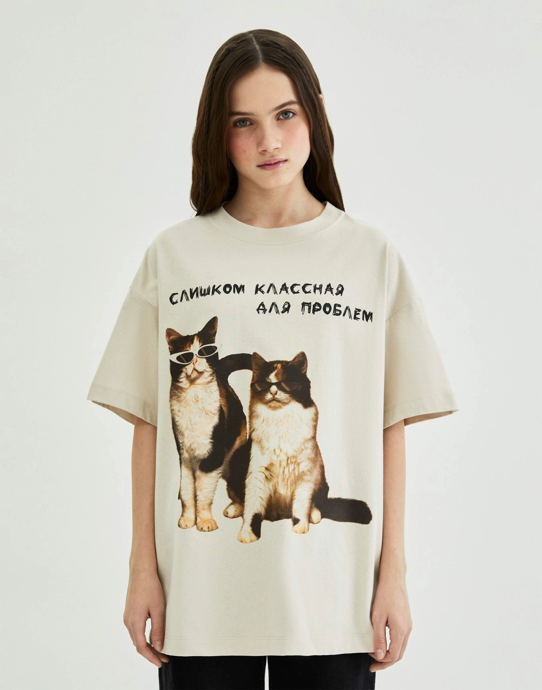 Бежевая футболка superoversize с принтом Gkt028231-1
