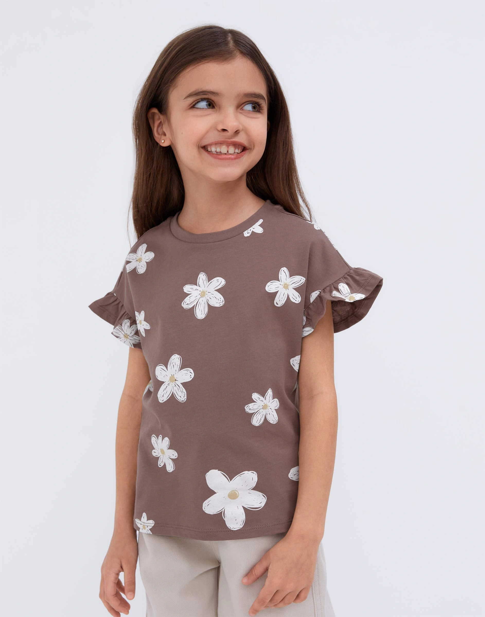 Коричневая футболка oversize с тотальным принтом для девочки Gkt026322-1