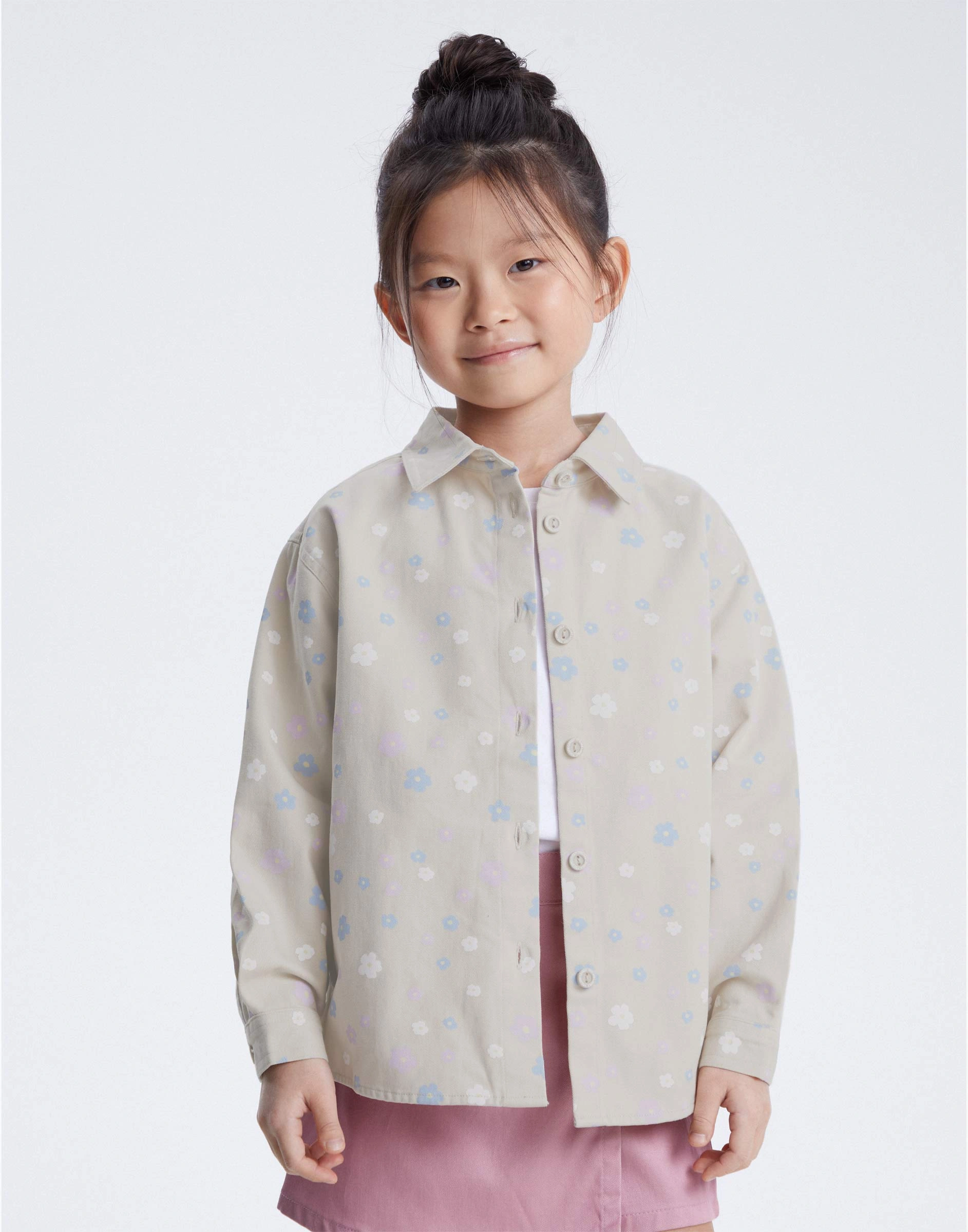 Светло-бежевая рубашка oversize с цветочным принтом для девочки Gwt003647-2