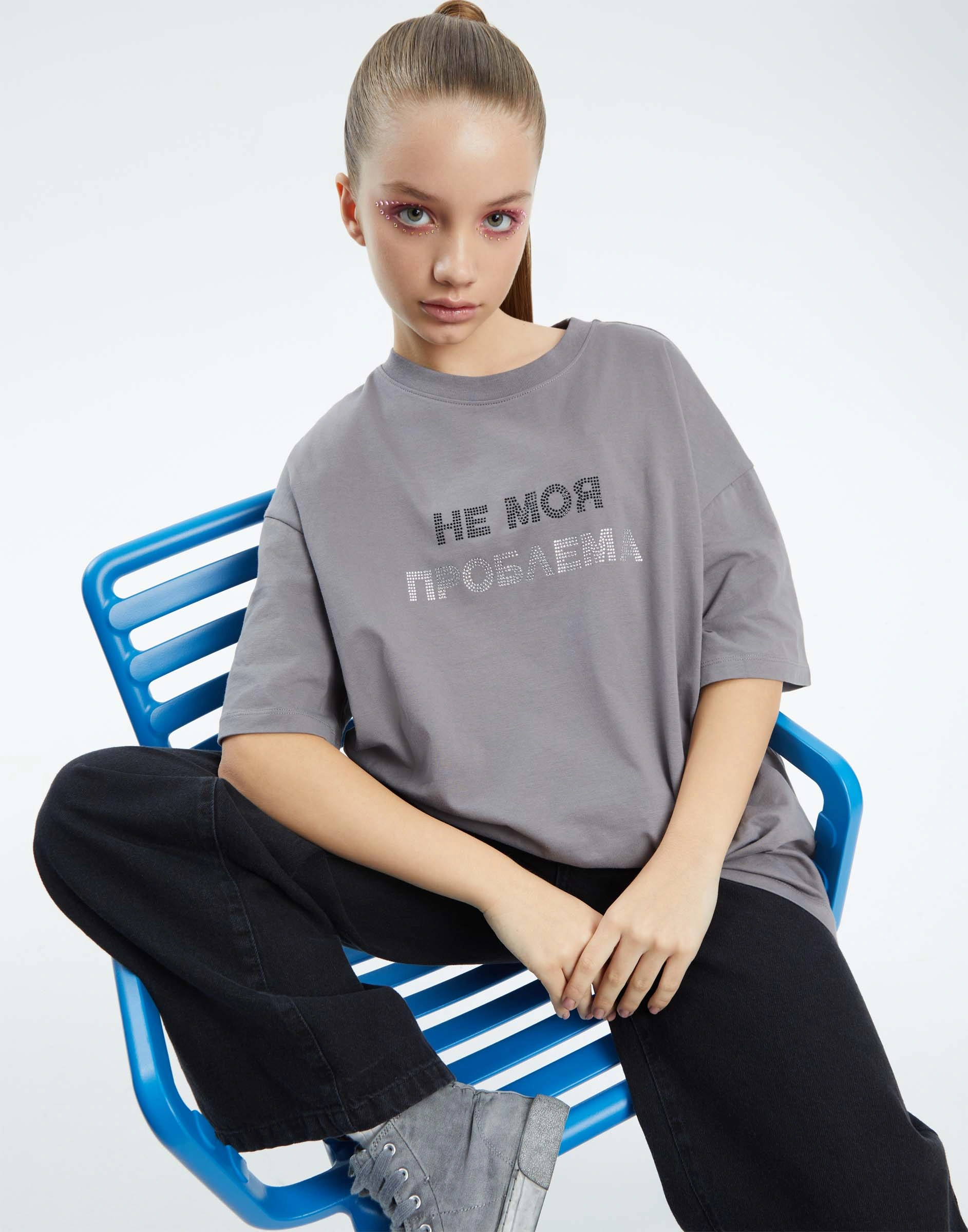Серая футболка oversize со стразами Gkt028184-1