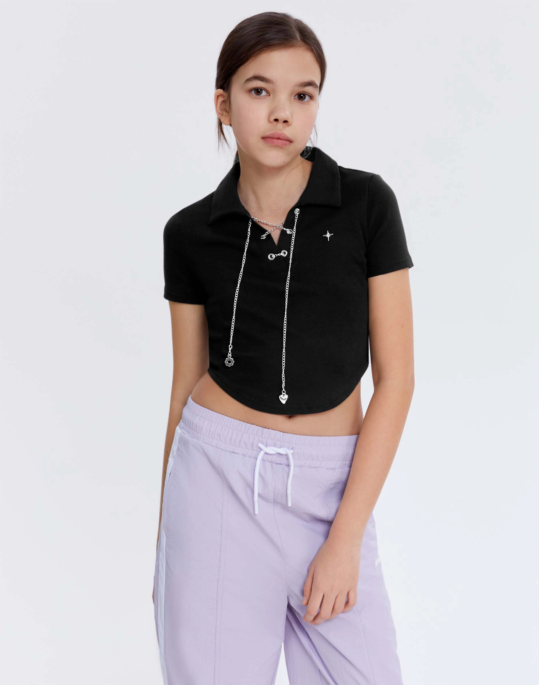 Чёрная футболка-поло с металлической цепью и лейблом Gkt026324-1