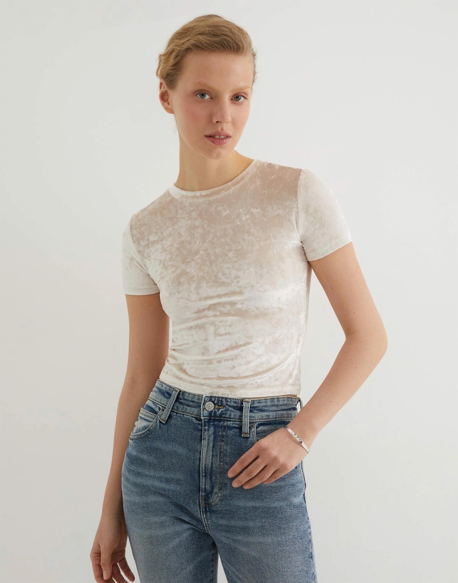Бежевая укороченная футболка из велюра Gkt027044-1