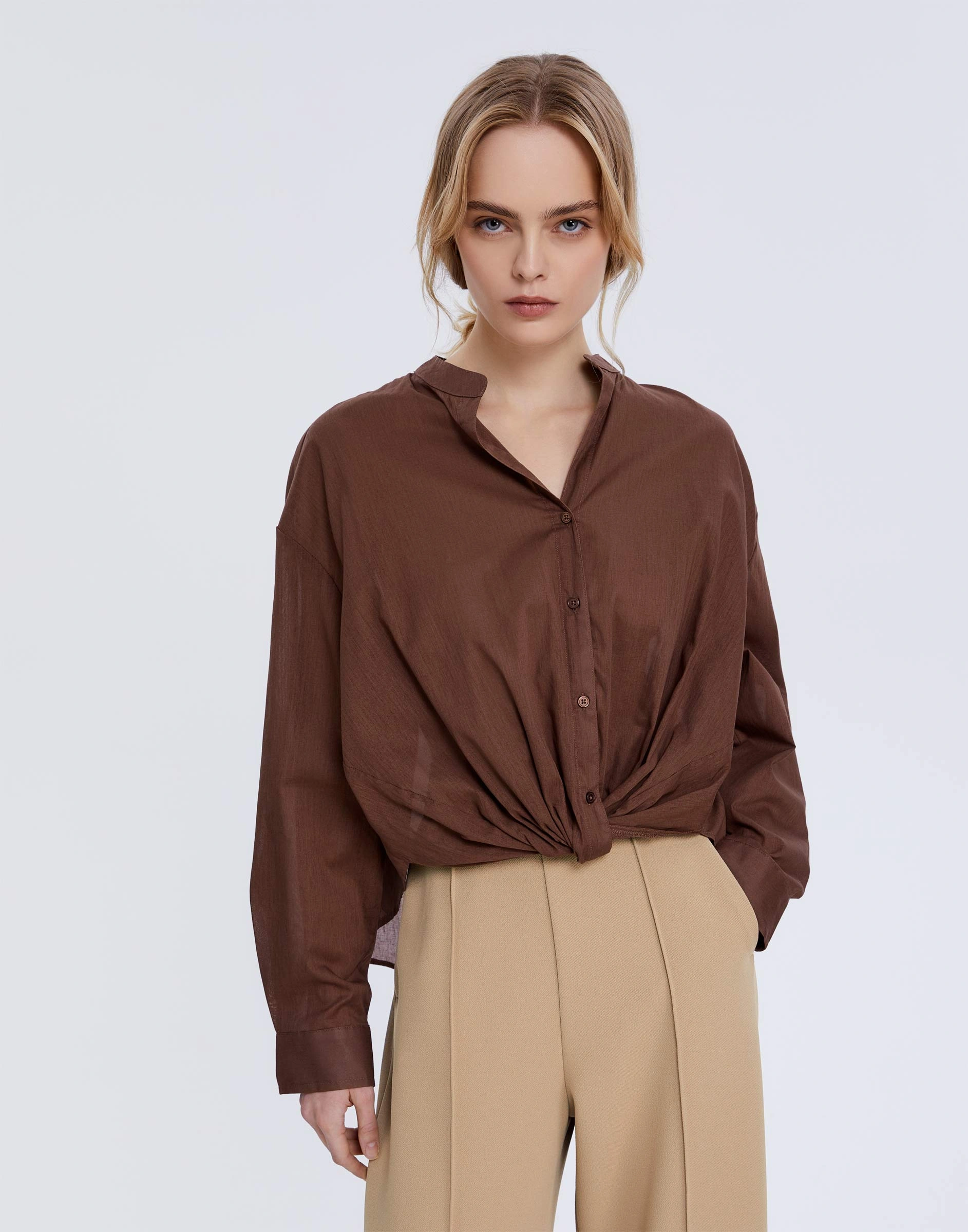 Коричневая рубашка oversize с воротником мао Gwt004704-4