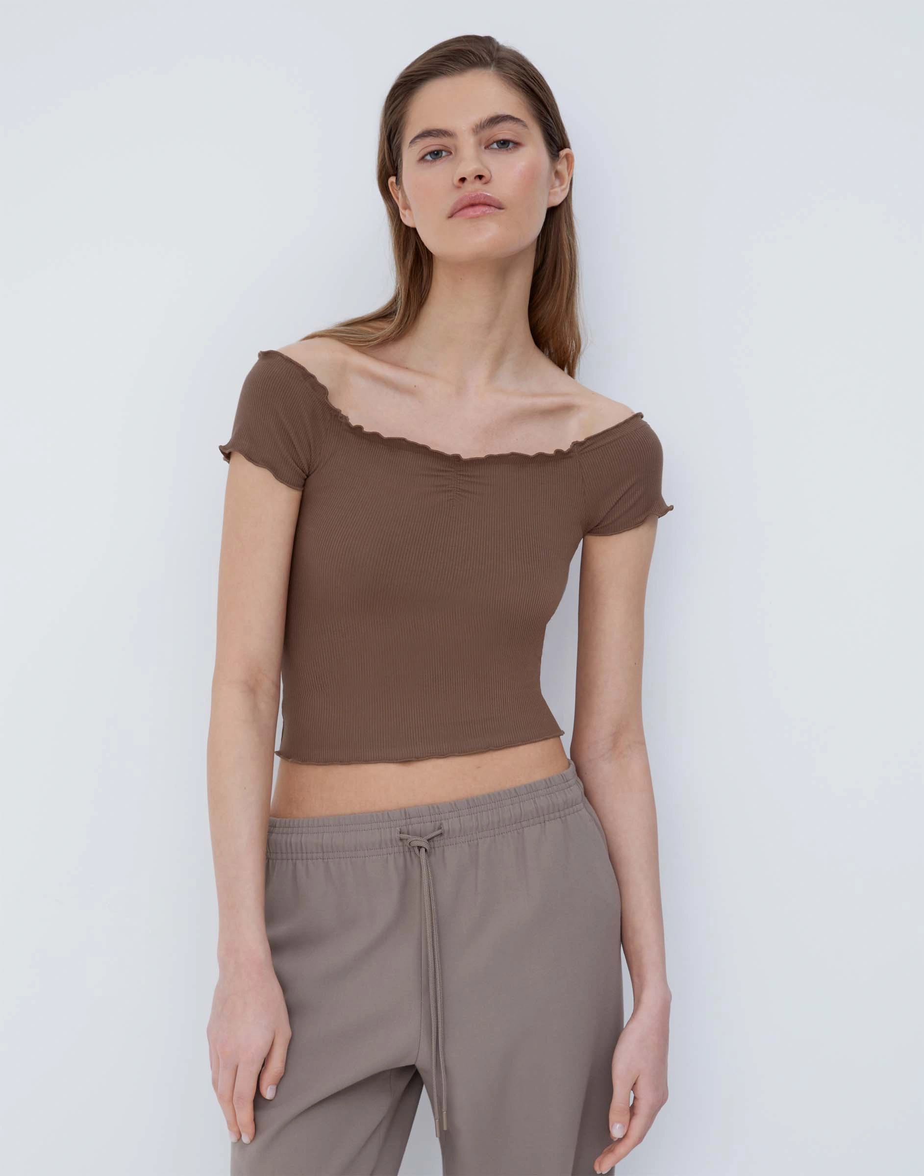 Коричневый кроп-топ в рубчик со сборкой Gkt026516-1