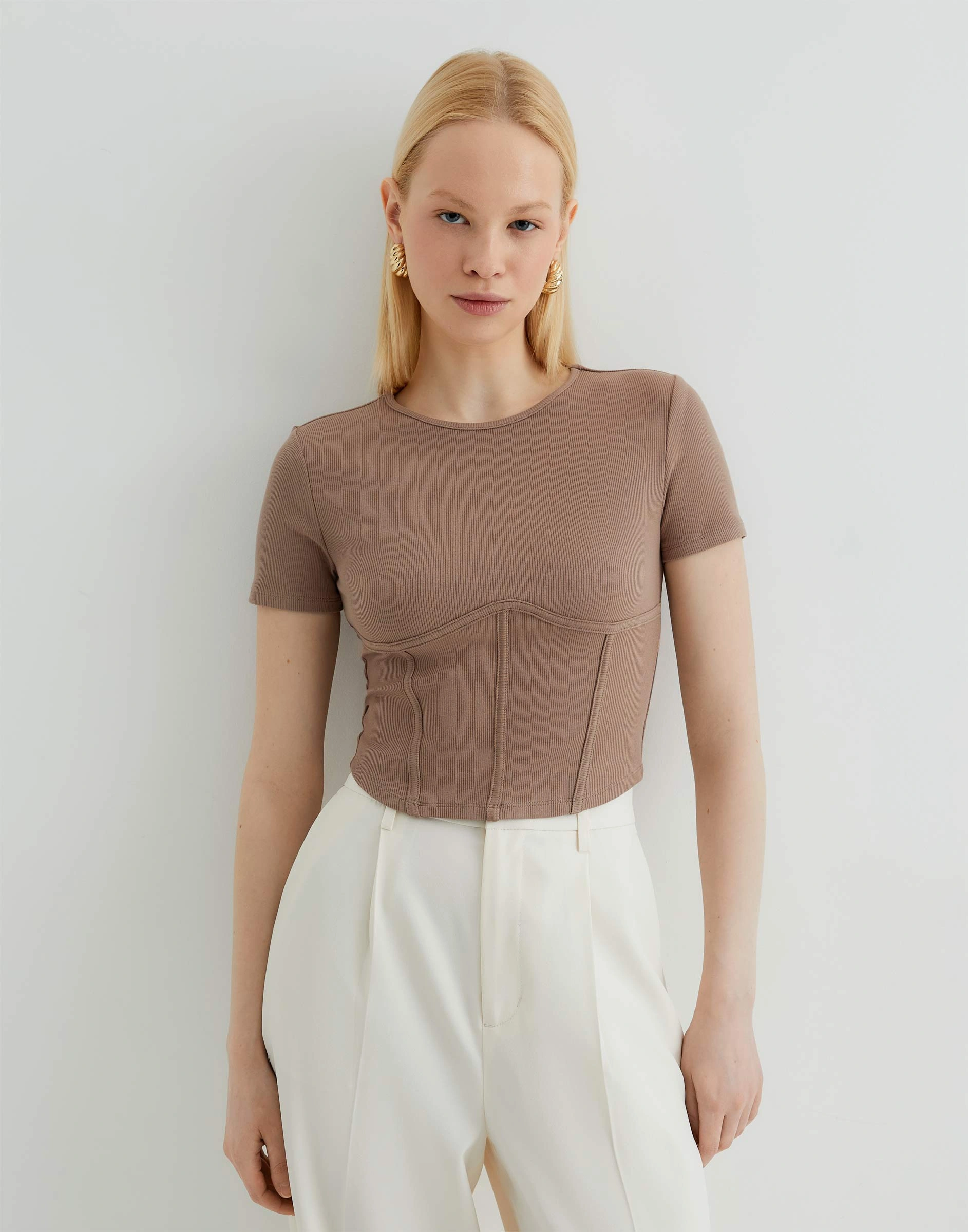 Кофейный кроп-топ с фактурными швами Gkt027078-1