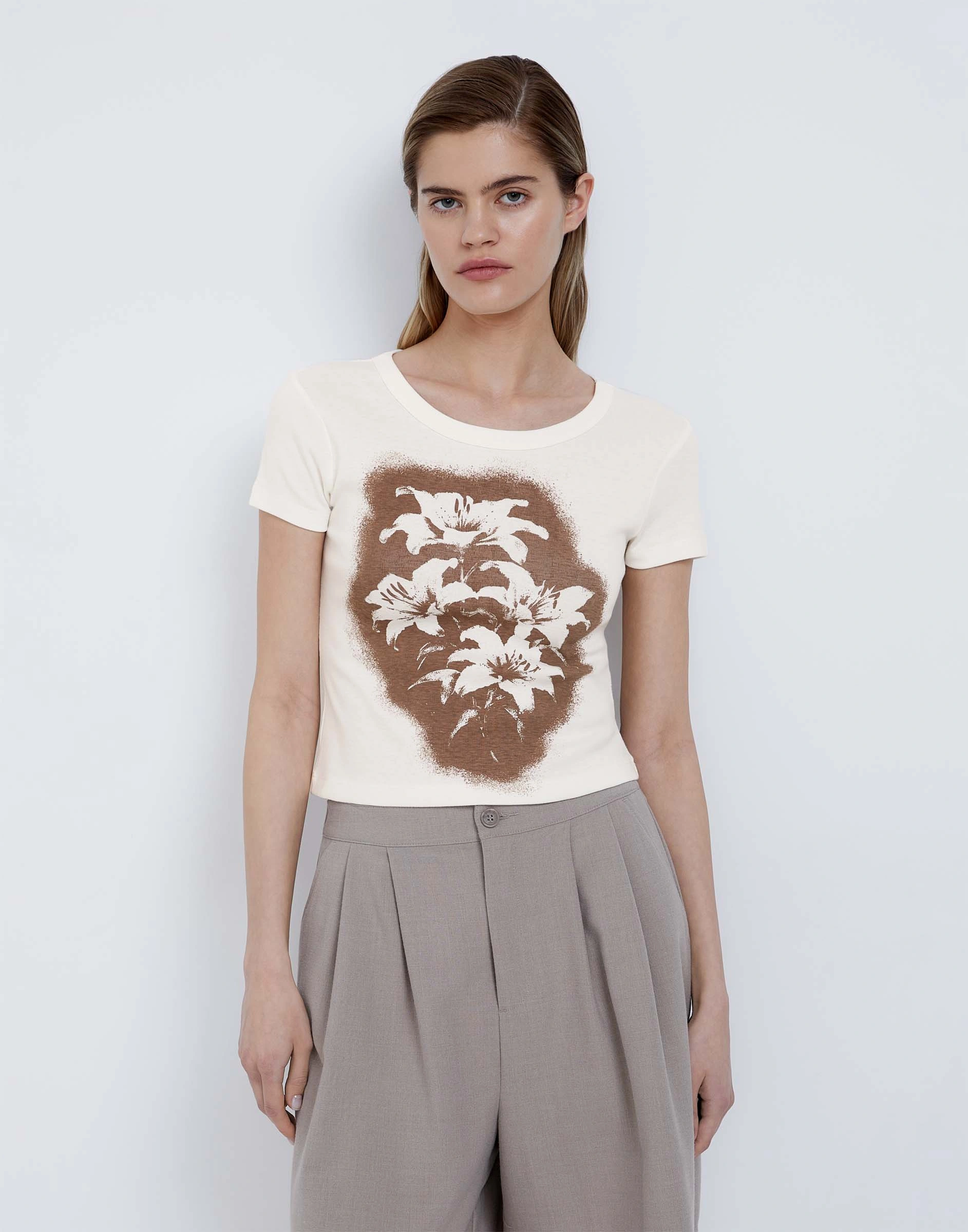 Молочная укороченная футболка в рубчик с принтом Gkt026513-2