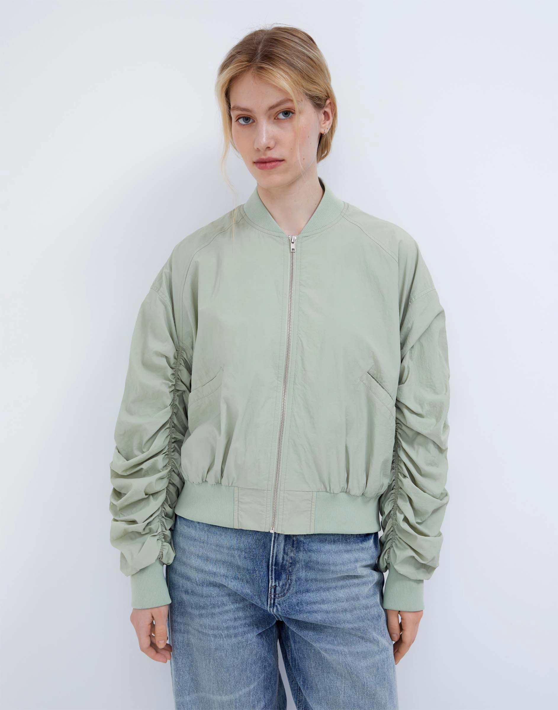 Оливковая куртка-бомбер oversize со сборками на рукавах Gow004432-2