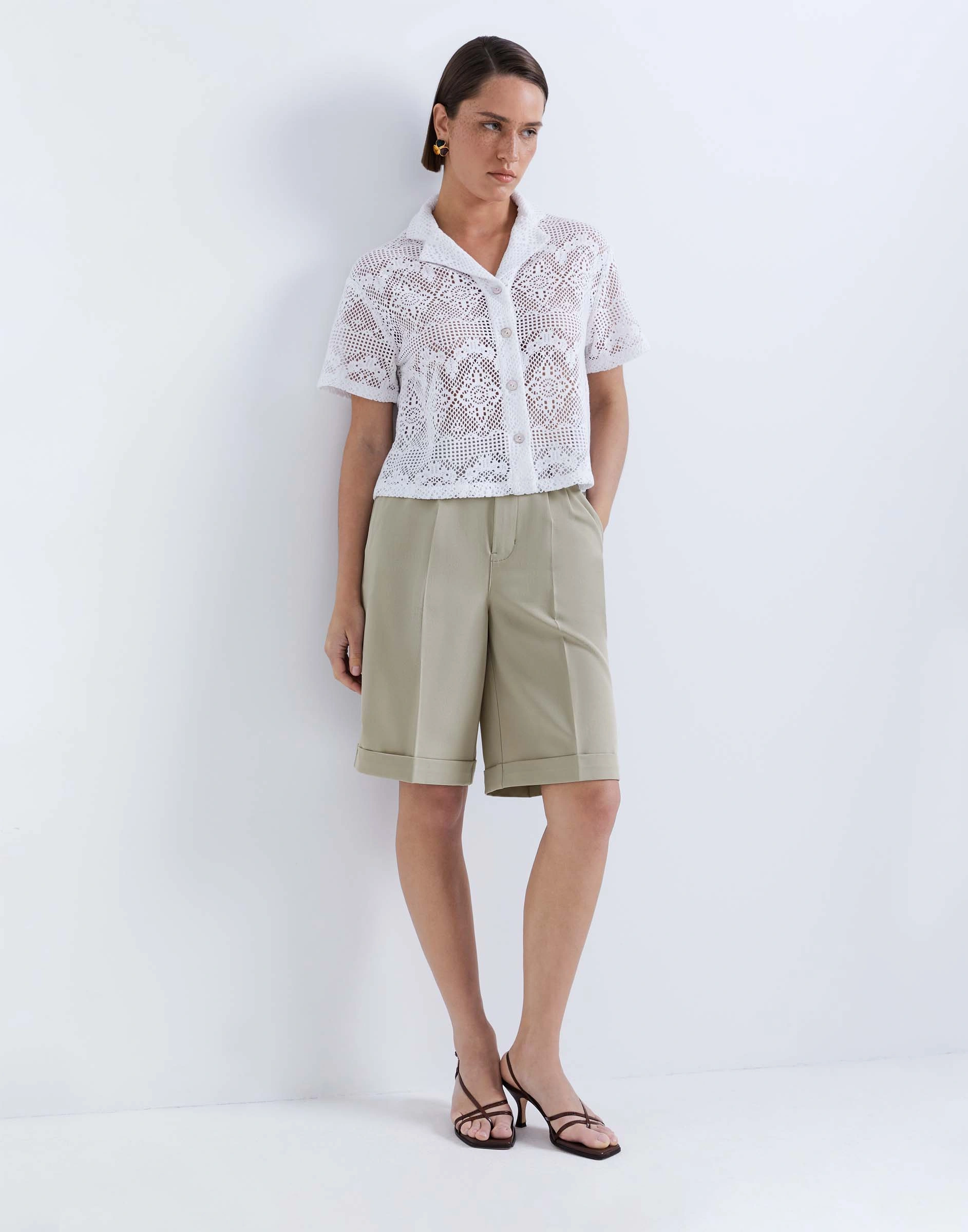 Оливковые шорты-бермуды Straight с защипами и подворотами Gsh012549-1