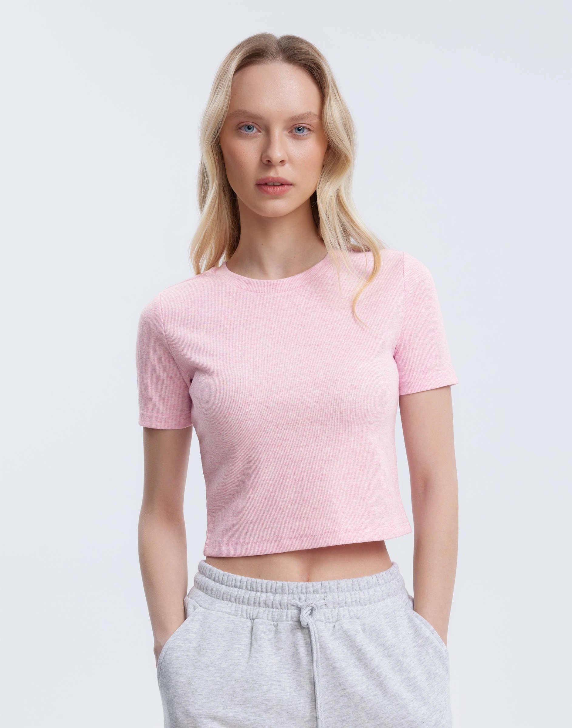 Розовая укороченная футболка в рубчик Gkt026710-1