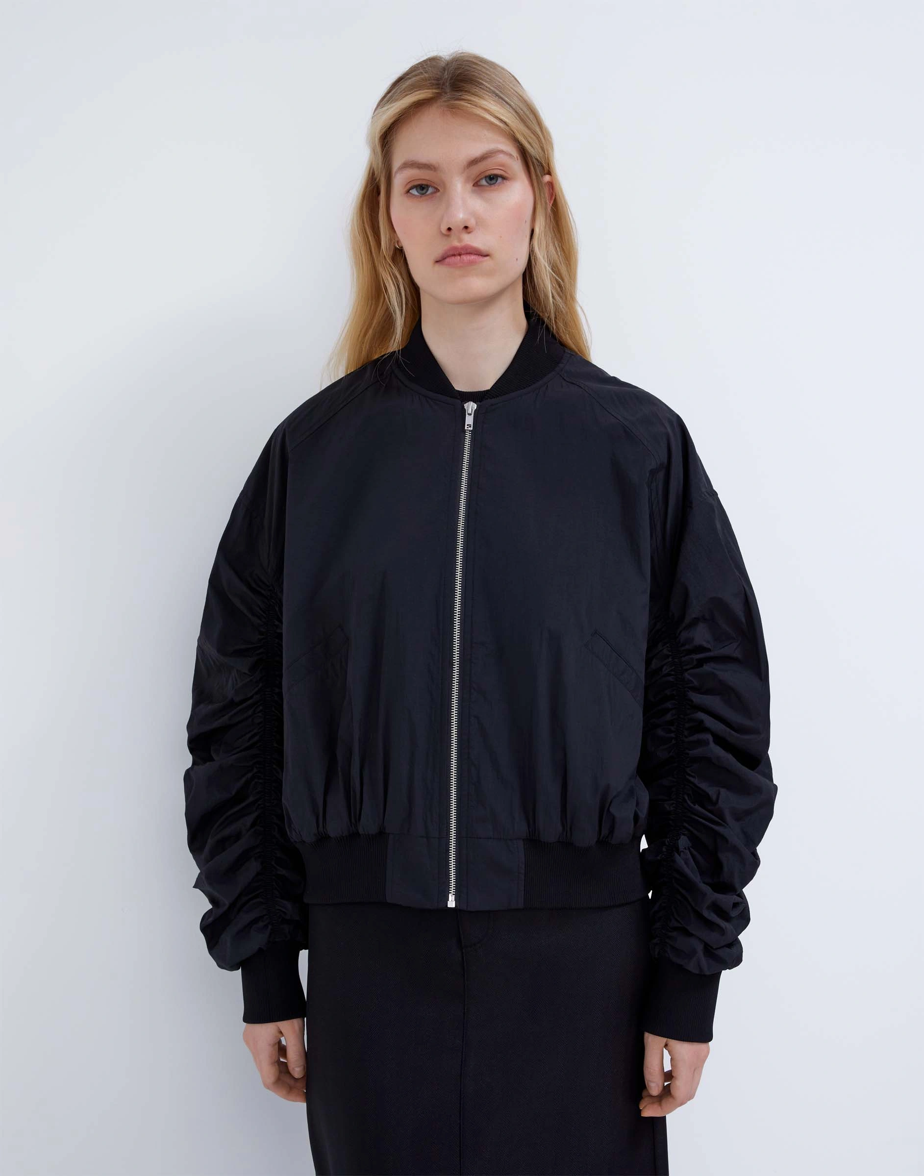 Чёрная куртка-бомбер oversize со сборками на рукавах Gow004432-1