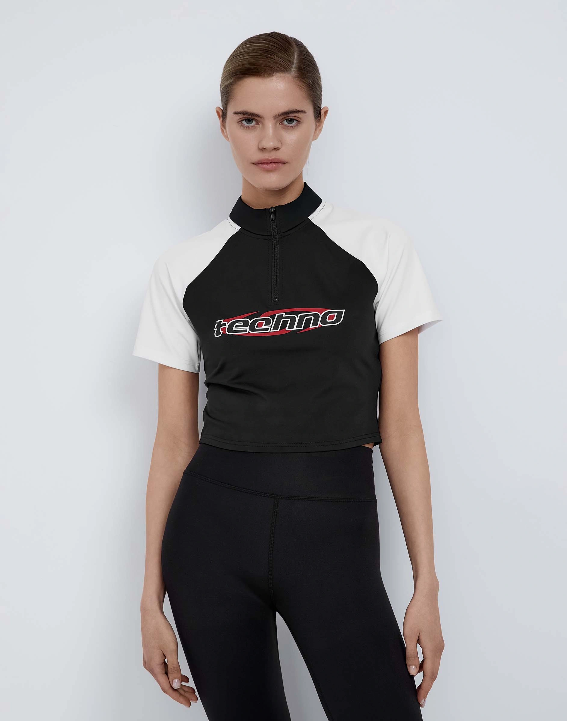 Чёрный кроп-топ колор-блок с принтом Gkt026837-1