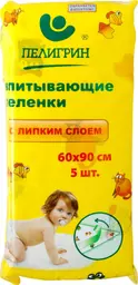 Пелёнки детские впитывающие Пелигрин с липким слоем 60×90 см, 5шт.