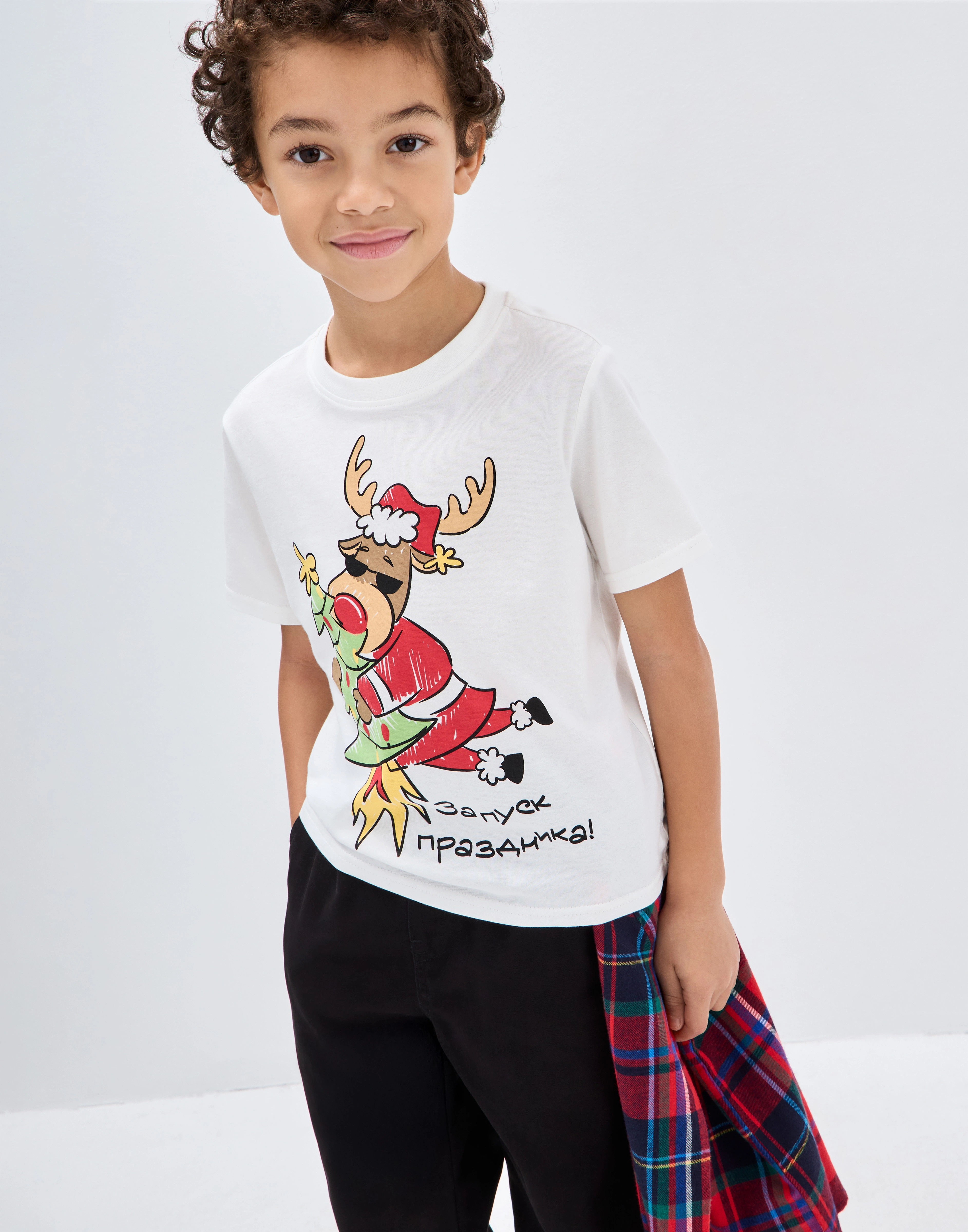 Молочная футболка с новогодним принтом для мальчика Bkt017520-2