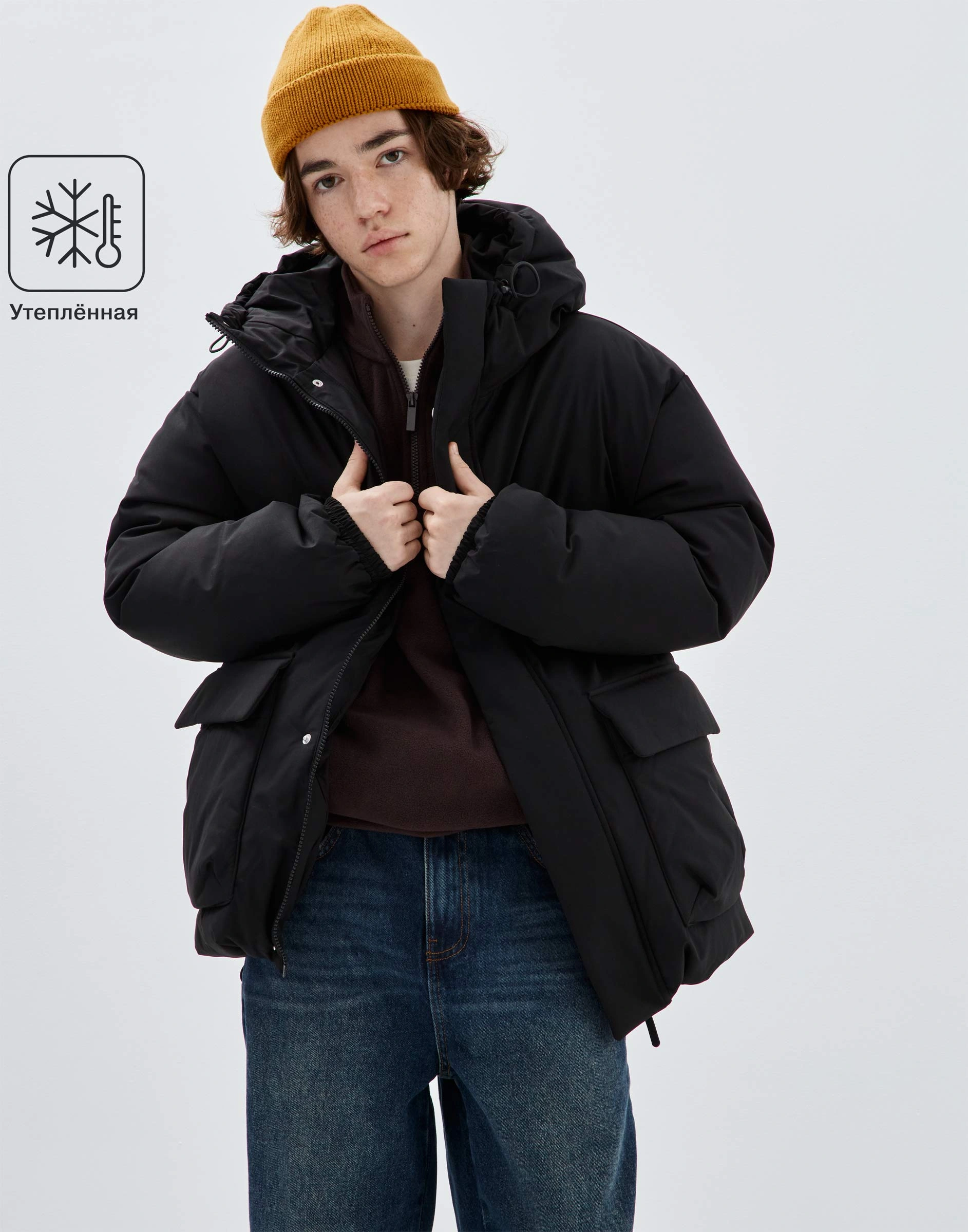 Чёрная утеплённая куртка оверсайз с капюшоном Bow002362-1