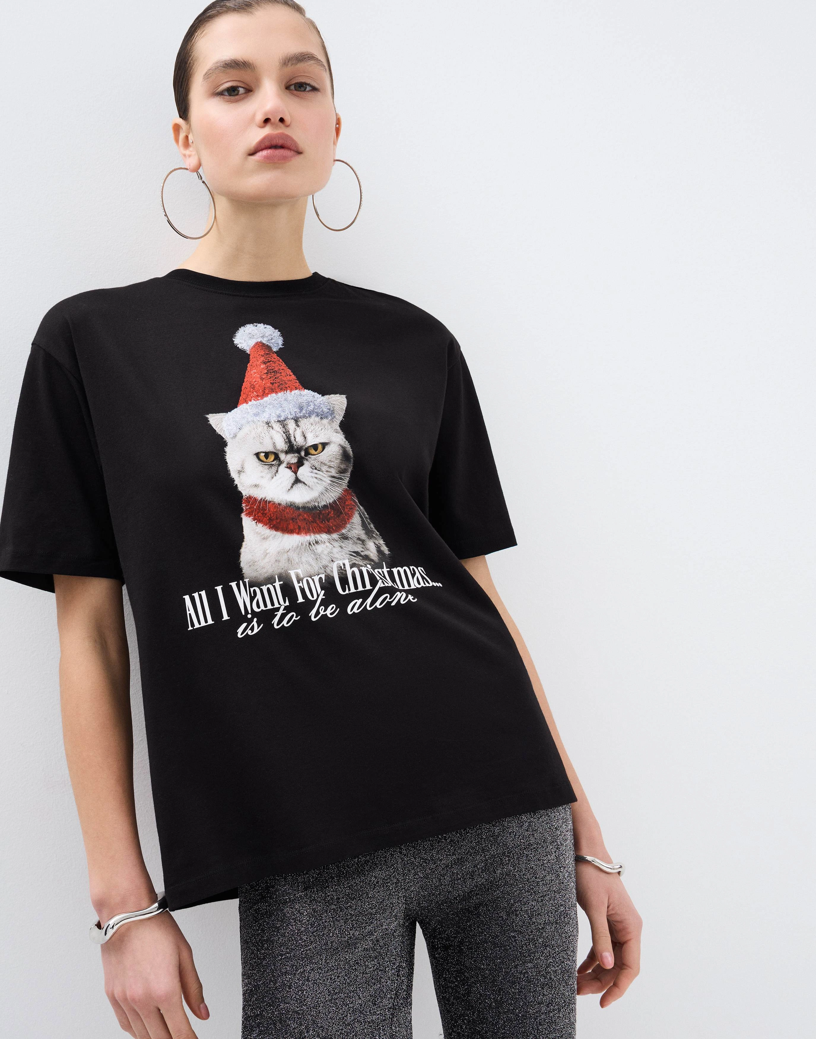 Чёрная футболка оверсайз с новогодним принтом Gkt029481-1