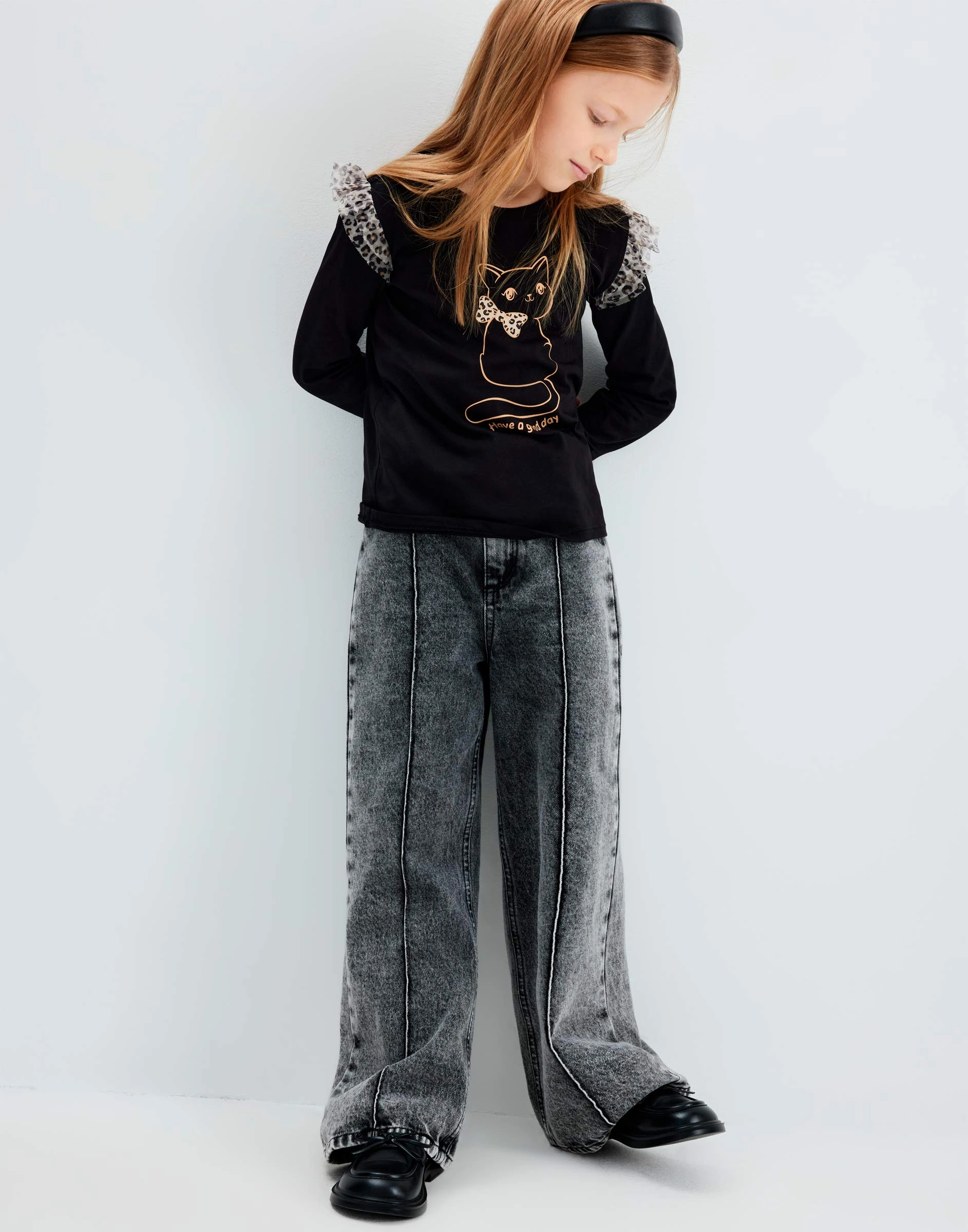 Чёрный лонгслив с оборками на плечах для девочки Gkt027246-2