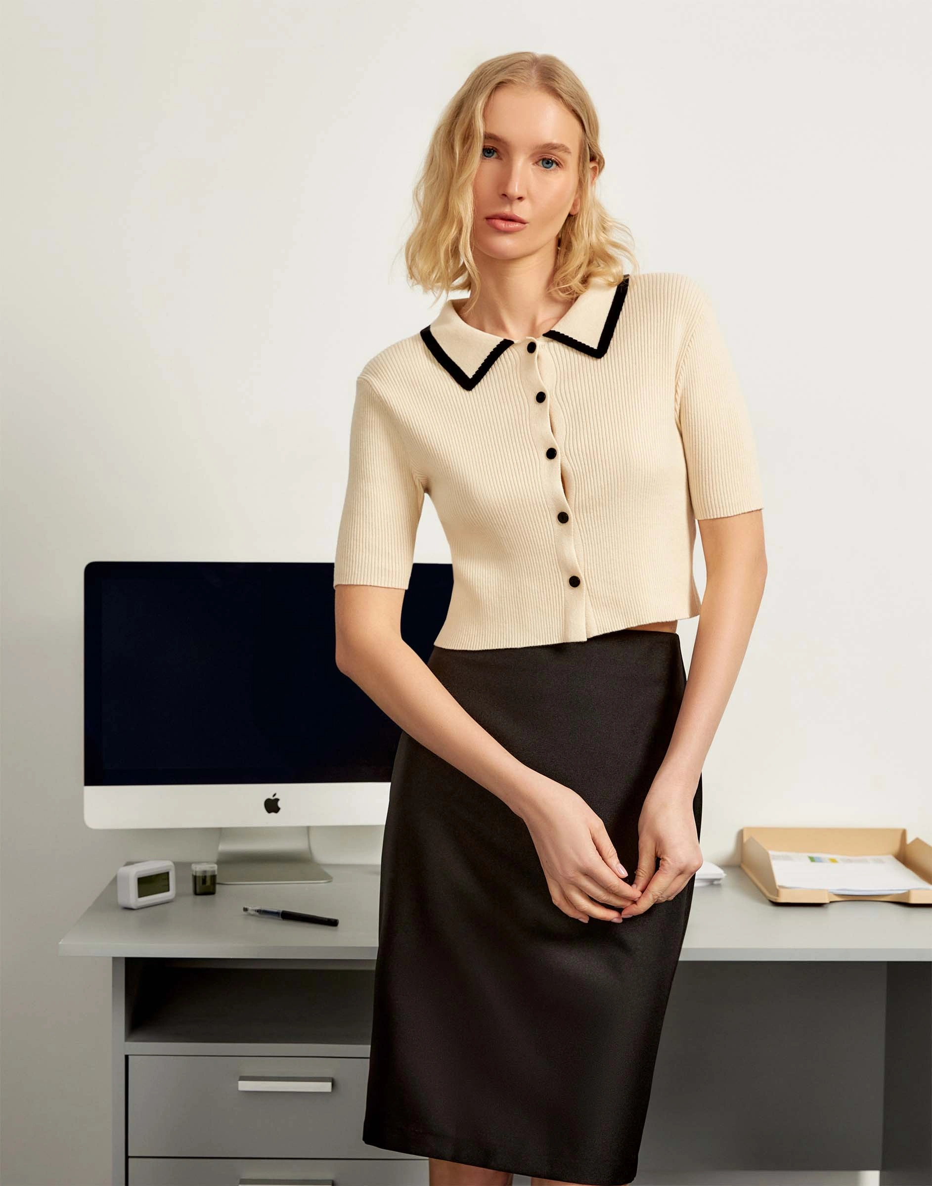 Молочный укороченный кардиган-поло в рубчик Gsw007914-1