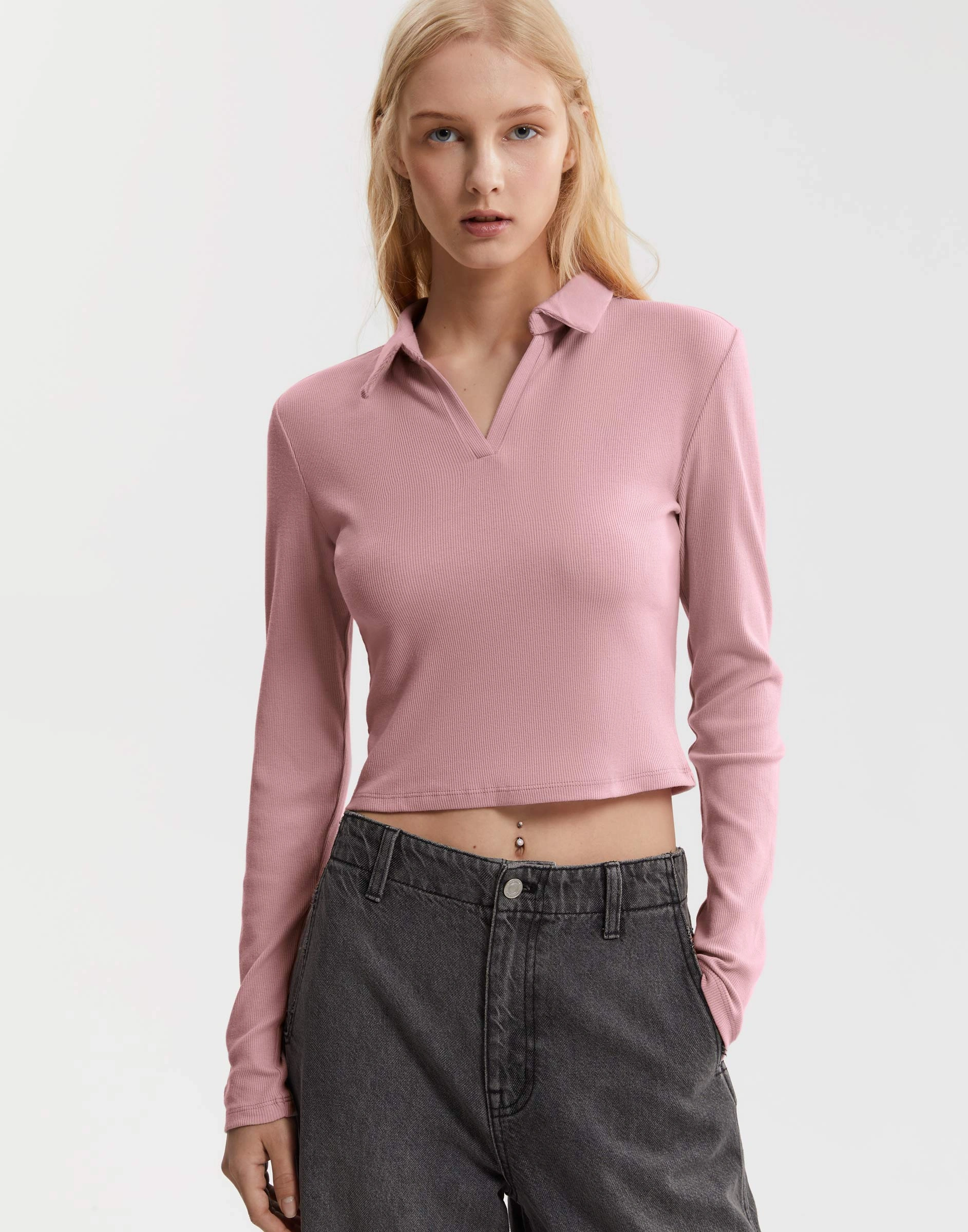 Пыльно-розовый укороченный лонгслив в рубчик с воротником поло Gkt026291-4