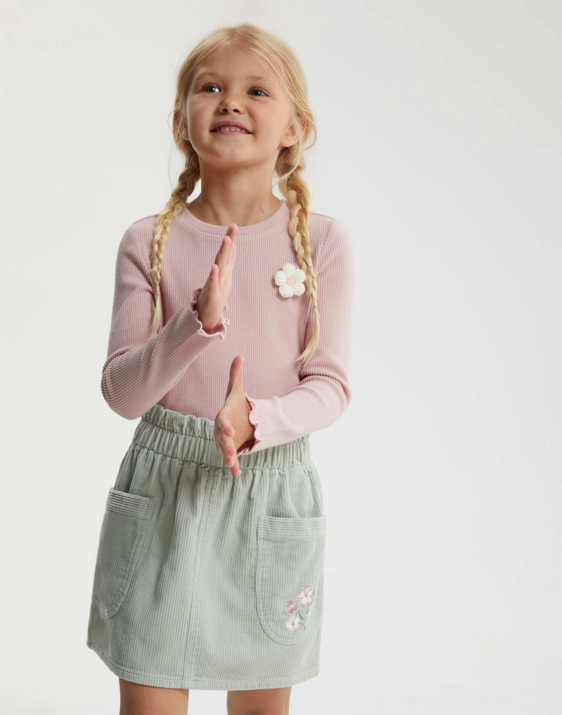 Мятная вельветовая юбка Paperbag с вышивкой для девочки Gsk019888-1