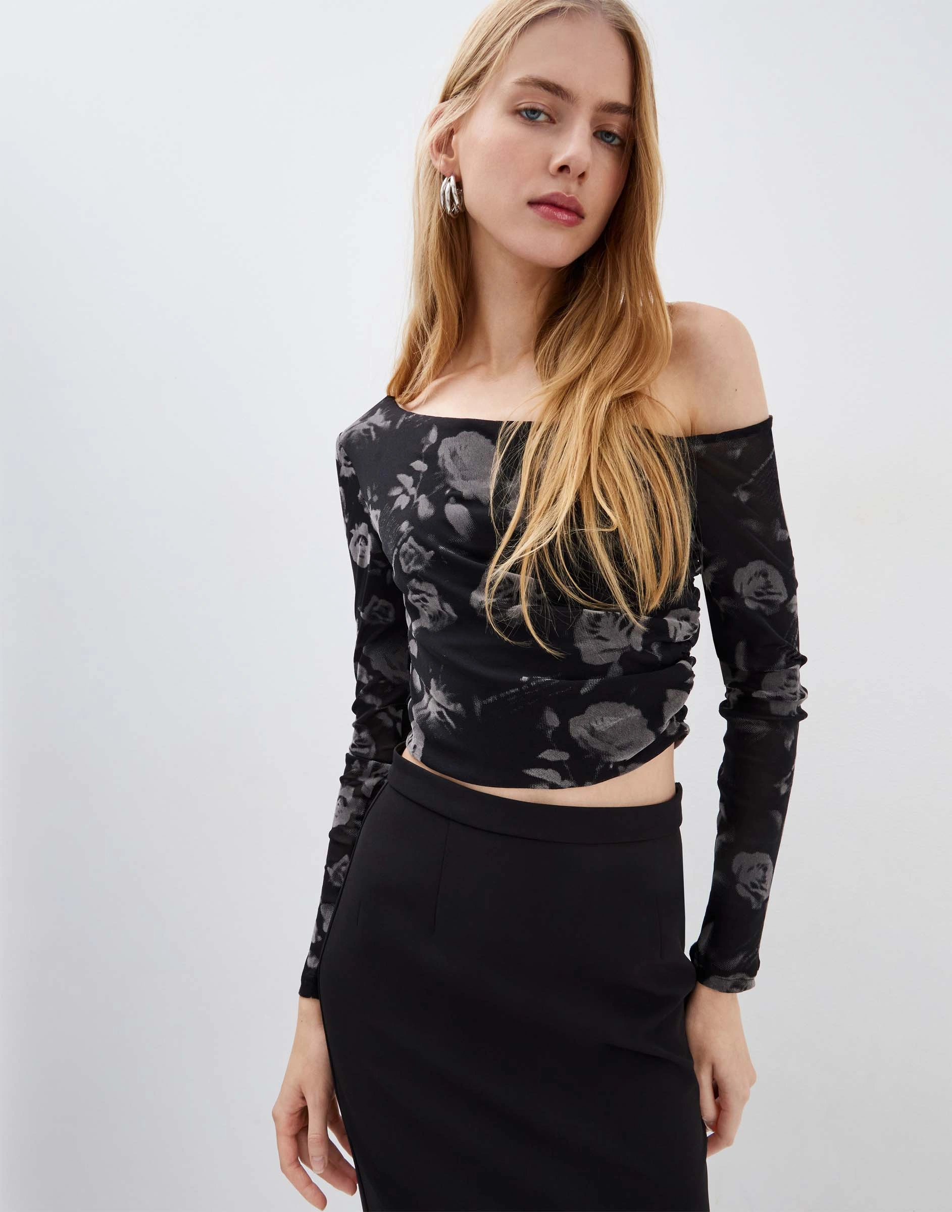 Укороченный лонгслив из сетки с драпировкой на одно плечо Gkt024509-1