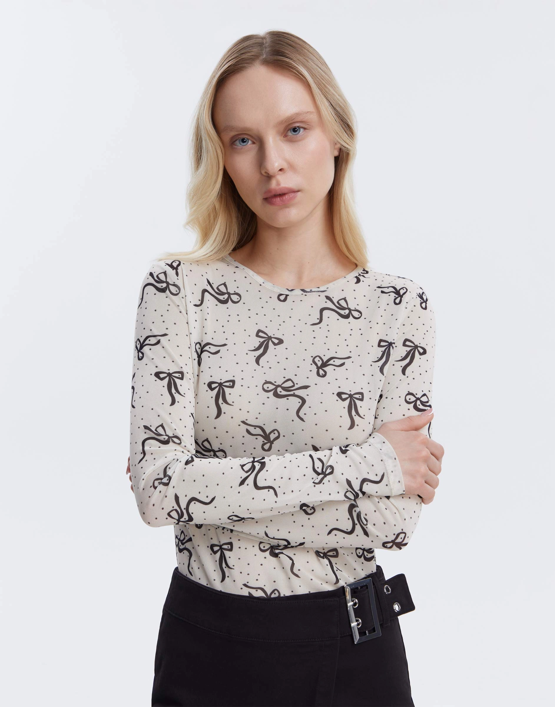 Бежевый сетчатый лонгслив с принтом Gkt026356-2