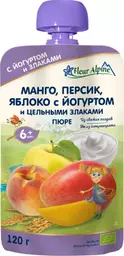 Пюре Fleur Alpine Манго, персик, яблоко с йогуртом и цельными злаками, с 6 месяцев, 120г