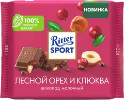 Шоколад молочный Ritter Sport с кусочками клюквы и орехом лещины, 100г