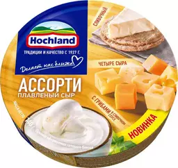 Сыр плавленый Hochland Желтое ассорти - Cливочный, Четыре сыра, C грибами в сливочном соусе 50%, 140г