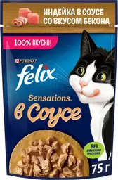 Влажный корм для кошек Felix Sensations с индейкой в соусе со вкусом бекона, 75г