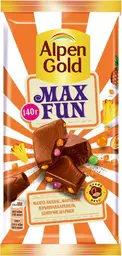 Шоколад Alpen Gold max fun молочный c фруктовыми кусочками, взрывной карамелью и шипучими шариками, 140г