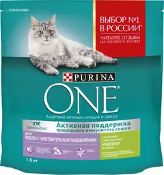 Корм сухой Purina One для взрослых кошек при чувствительном пищеварении с индейкой и рисом, 1.5кг