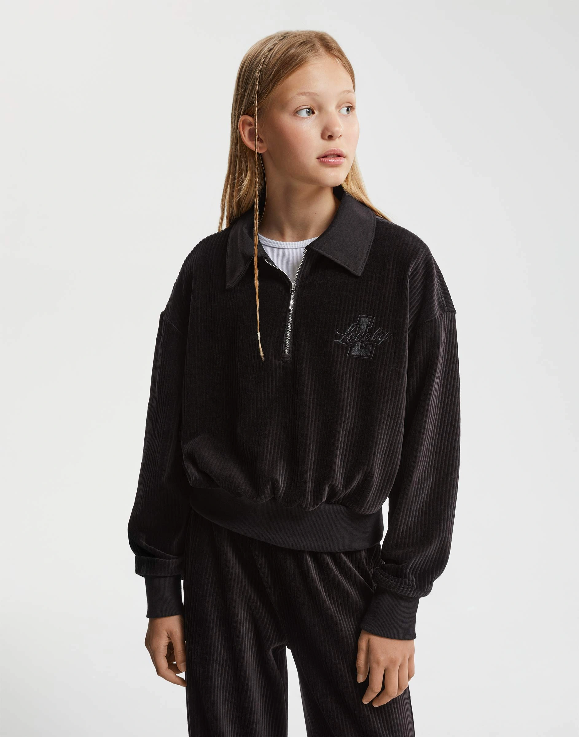 Чёрный свитшот из вельвета на полумолнии с вышивкой Gac025346-1