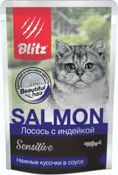 Блиц консервированный корм для кошек Сенситив/лосось, индейка кусочки в соусе 85 г