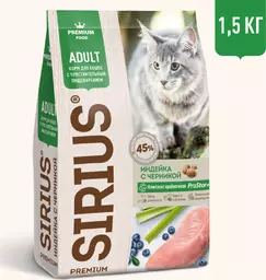 Сириус сухой корм для кошек Чувствительное пищеварение/индейка, черника 1500 г