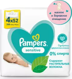 Влажные салфетки детские Pampers Sensitive без отдушки 0+, 208 шт