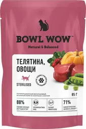 Корм Bowl Wow кусочки в соусе с телятиной и овощами консервированный полнорационный для стерилизованных кошек, 85г