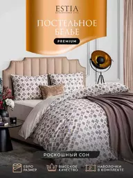 Комплект постельного белья евро Estia Ансари перкаль цвет: синий/серо-бежевый/какао, 4предмета