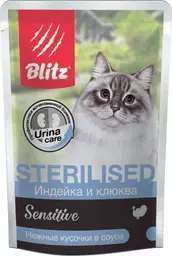 Влажный корм для кошек Blitz Sterilised индейка-клюква нежные кусочки в соус, 85г