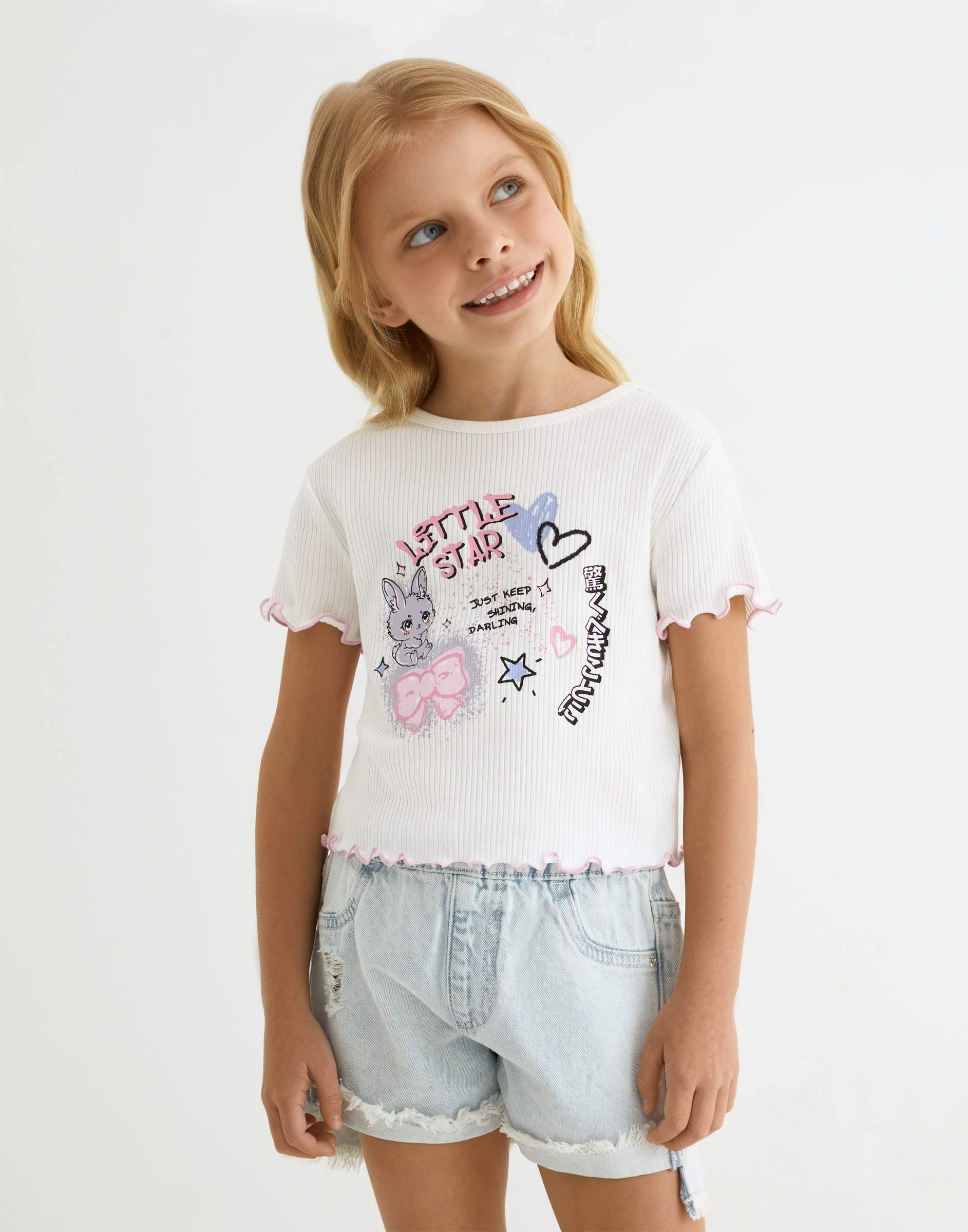 Молочная футболка в рубчик с граффити-принтом для девочки Gkt026174-2