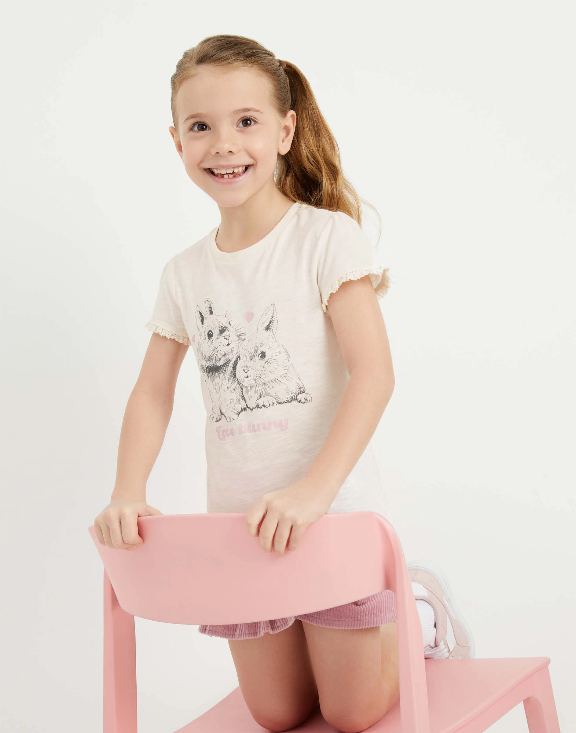 Молочная футболка с пышными рукавами и принтом для девочки Gkt022774-2
