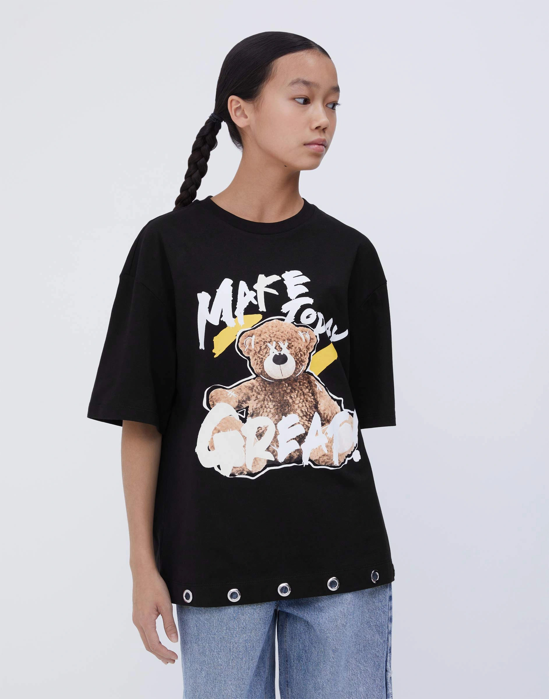 Чёрная футболка oversize с принтом и люверсами Gkt025727-1