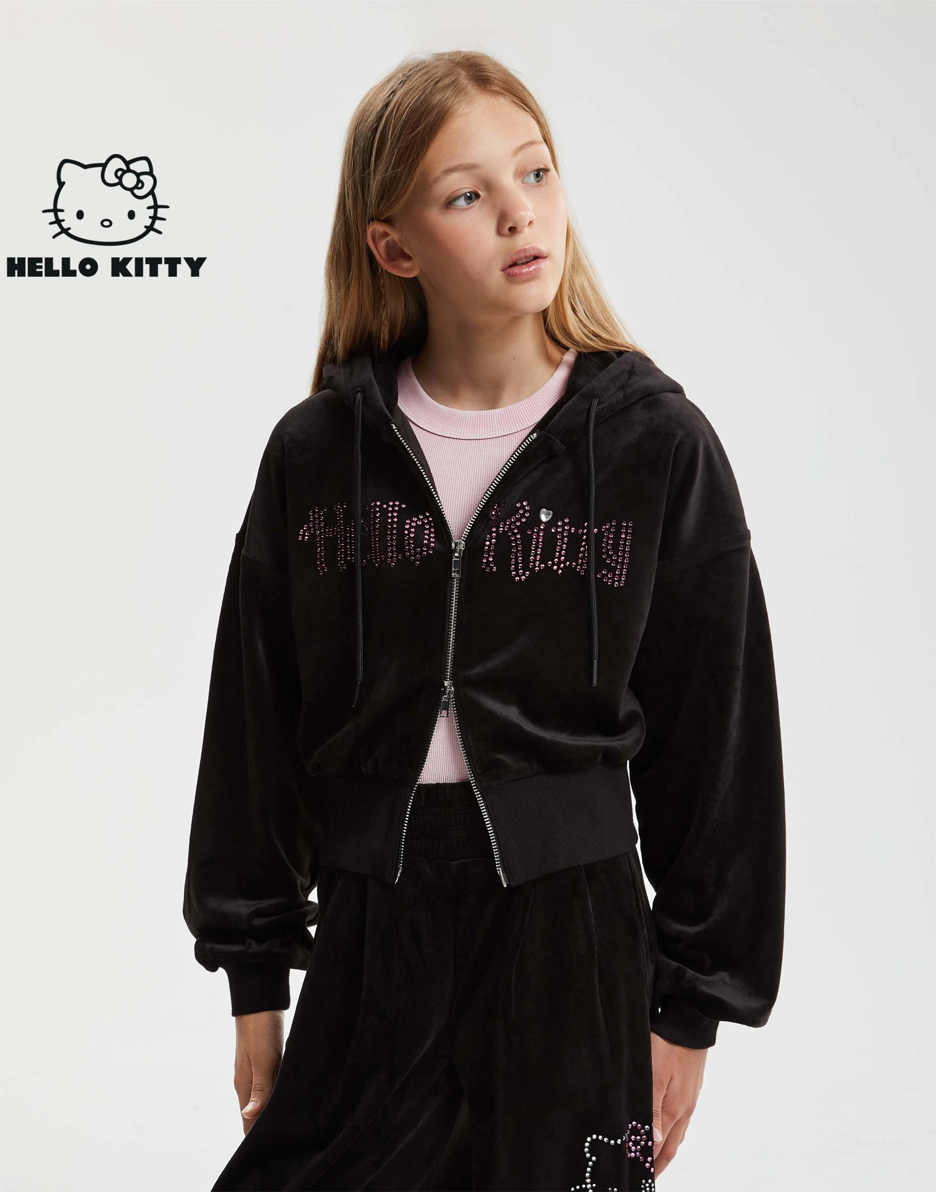 Чёрное укороченное худи на молнии с надписью Hello Kitty из страз Gac024889-1