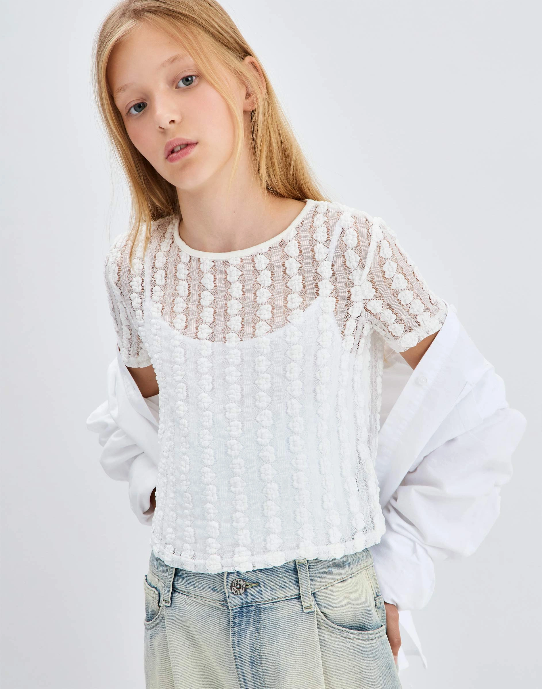 Молочная кружевная футболка Gkt026268-2