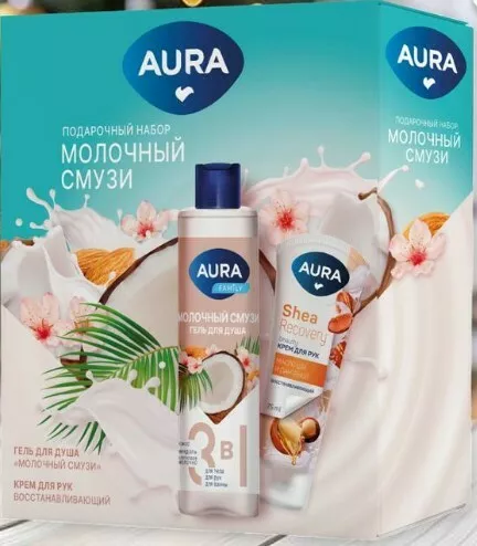 Подарочный набор Аура Гель д/душа 250мл Молочный смузи+ Крем д/рук 75мл Восстанавливающий