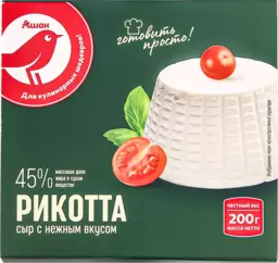 Сыр мягкий сывороточный творожный Рикотта Ашан Красная птица 45% Бзмж, 200 г