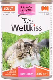 Wellkiss Влажный корм (консервы) для кошек, нежные кусочки с лососем и тунцом в желе, 410 гр.