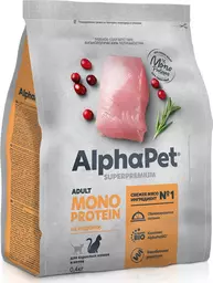 Alphapet Monoprotein Superpremium Сухой корм для взрослых кошек, с индейкой, 400 гр.