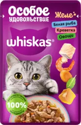 Влажный полнорационный корм Whiskas Особое удовольствие для взрослых кошек желе с белой рыбой, креветками и овощами, 75г