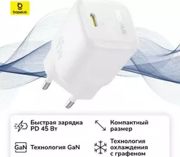 Сетевое зарядное устройство Baseus Picogo Gan Fast Charger 1C 45W Eu Moon White